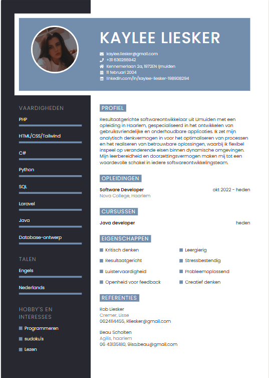Hoi! Ik ben Kaylee, 21 jaar, en momenteel in mijn laatste jaar van de opleiding Software Developer MBO niveau 4 op het Nova College.